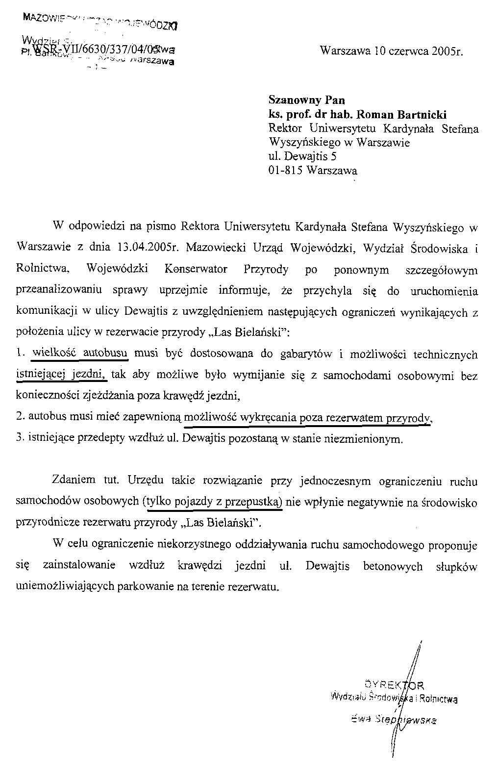 Pismem WŚR VII/6630/337/04/05 z 10.06.05 r. do Rektora UKSW [ PNG, 34 kB] Wojewódzki Konserwator Przyrody wydał warunkową zgodę na ruch autobusów komunikacji miejskiej przez rezerwat Las Bielański po ul. Dewajtis. Jednym z warunków było zachowanie niezmienionych ścieżek dla pieszych wzdłuż tej ulicy. Tymczasem wykonany na zlecenie U.Dz. Bielany projekt dostosowania drogi do wymogów komunikacji autobusowej zawiera budowę chodnika, na który Konserwator nie wydał zgody. Podczas posiedzenia Komisji Ekologii Bielan 20.02.br. skonfrontowano opinie Urzędu Dzielnicy i przedstawiciela Konserwatora. Wyszło na jaw, że wydano publiczne pieniądze (podobno kwotę 50 tys. zł) na projekt, który można by zrealizować jedynie wbrew opinii Konserwatora, a więc nielegalnie. Dlaczego urzędnicy odpowiedzialni za zlecenie tego projektu nie zadbali o to, by spełniał on postawione wymagania i był możliwy do legalnej realizacji? W jakim celu uzyskano dla niego u Inżyniera Ruchu opinię komunikacyjną nr 2114/05? Czyżby zamierzano go realizować łamiąc nakazy organu właściwego dla ochrony przyrody, ze szkodą dla prawnie chronionego rezerwatu?